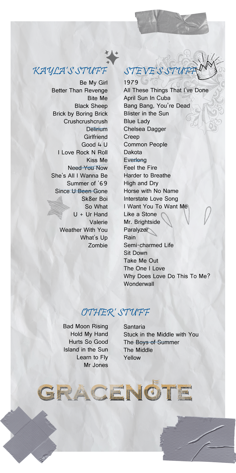 Consider us for your next event, birthday party, or wedding. Our musical range will help enhance the festivities and have people singing the hits for hours! For more information, be sure to reach out to us on our socials. Or email info@gracenote.band.